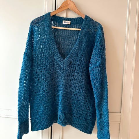 Baum und Pferdgarten cardigan i størrelse S. Fremstillet i en blanding af 50% mohairuld og 50% akryl. Cardiganen har en orange farve og en åben, strikket struktur.