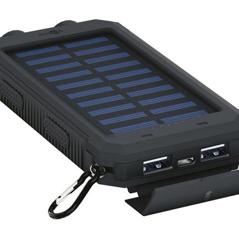 Jeg sælger denne powerbank som er velegnet til survival kits eller vandreture. Den har en kapacitet på 10.000 mAh, indeholder solceller, lygte, kompas og to forskellige USB-A udgange.