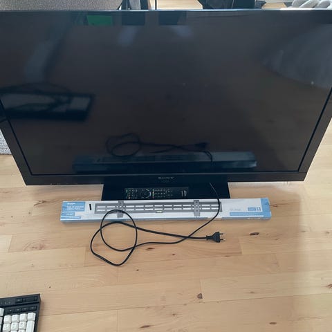 Gammelt 40" fladskærm fra Sony. Fjernbetjeningen trænger til en rensning, men det hele virker ellers fint, vi blev blot fristet ved dettes års Black Friday...