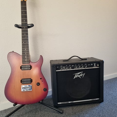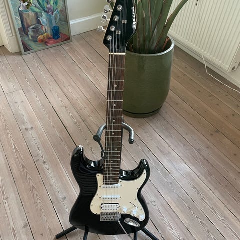 Elektrisk guitar i sunburst farve. Instrumentet har en klassisk form og er velegnet til forskellige musikgenrer.