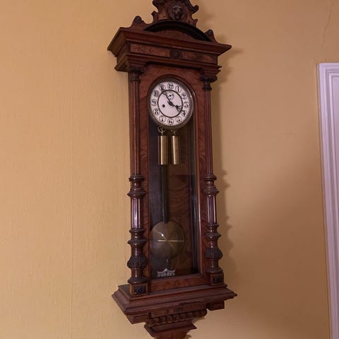 Antikt vægur fremstillet i træ med pendul. Uret har en rund urskive med sorte tal og visere. Designet til vægophæng.
