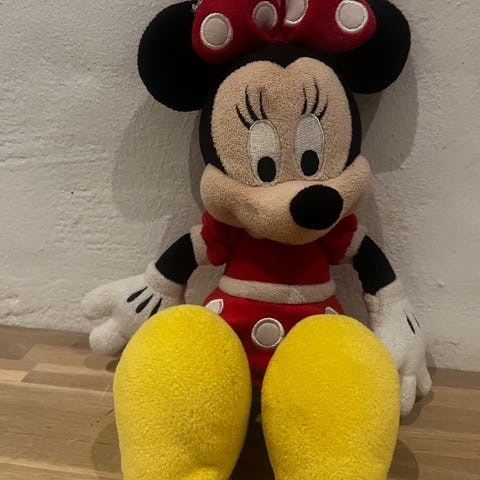 Disney Minnie Mouse bamse med pink kjole og sløjfe med hvide prikker. Bamsen har store hvide handsker og pink sko. Velegnet som legetøj eller samlerobjekt.