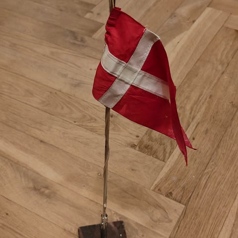Højst på marmor-fod er H: 62 og fod 9 x 9 cm (Dannebrog er falmet)