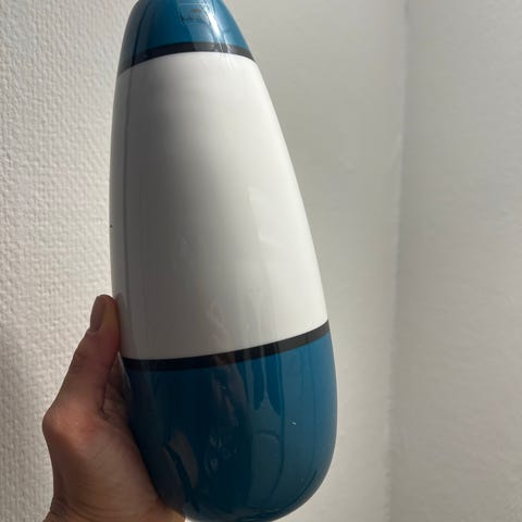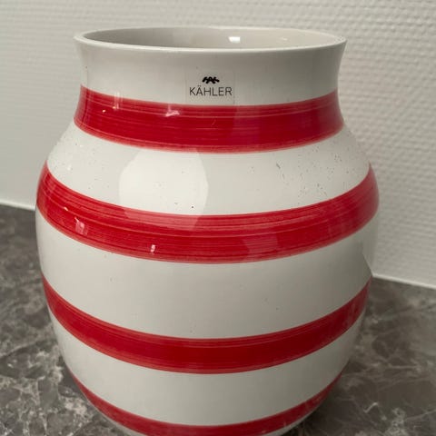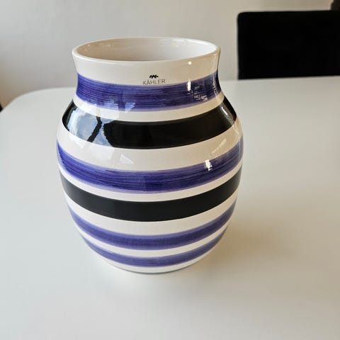 vase med en rund form og smal hals. Vasen har en blå og beige glasur med et mønster