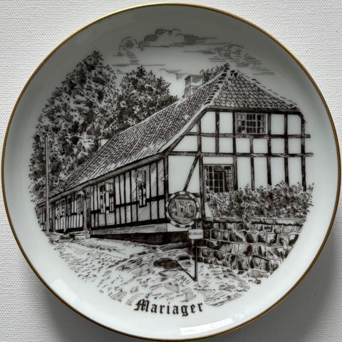 Flot hvid platte fra Bing & Grøndahl i brun stregtegning med guldkant med en brolagt gade i Mariager som motiv.