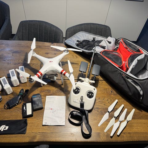 Dronen flyver fint. Der følger et ekstra batteri med, oplader, ekstra popelblade, samt holder til kamera og skærm til live visning. Jeg har købt den brugt og ikke selv testet kameradelen.
