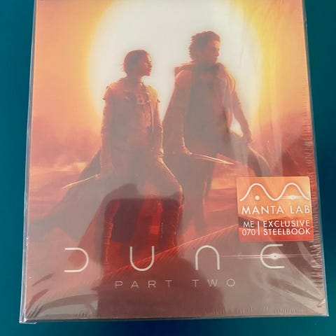 Manta Lab Dune Part Two Blu-ray Steelbook featuring exclusive full slip (4K UHD), collectible art, slip booklet, postcard & envelope. Limited edition with numbered holographic seal.
