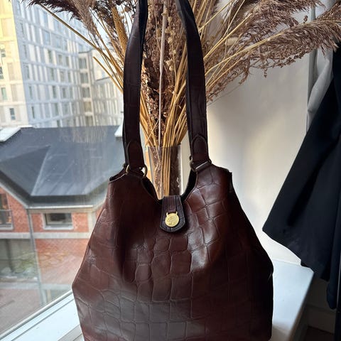 En elegant og sjælden Mulberry Edna Chain i en varm brun farvetone. Modellen betragtes som “søsteren” til den populære Mulberry Lily, med et lignende udtryk men et mere rummeligt og struktureret design. Det bløde Shrunken Calf-læder har en markant, naturlig tekstur og en naturlig, minimal glans. Læderet er behageligt at røre ved, holder formen godt, og farven fremstår både klassisk og alsidig.