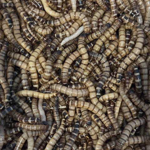 Sunde zophobas larver fra egen opdræt. Kaldes også mega melorme. De bliver fodret med forskelligt frisk grønt (agurk, salat, gulerødder, æbler etc) hver dag og økologisk tørfoder (hvede- og havreklid, korn, gryn, brød etc).