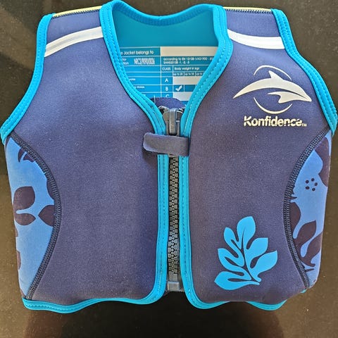 Konfidence Svømmevest til børn i blå og sort farve. Vesten er polstret for komfort og sikkerhed under svømning. Designet til at hjælpe børn med at holde sig flydende i vandet.