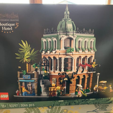 LEGO Boutique Hotel byggesæt med 3066 dele. Sættet forestiller en detaljeret bygningsmodel med flere etager og forskellige arkitektoniske elementer. Inkluderer minifigurer og forskellige tilbehør, der kan bruges til at skabe en byscene.