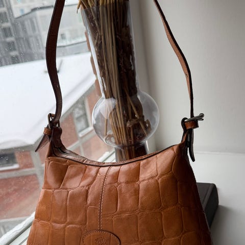 En sjælden og karakteristisk vintage Mulberry-model fremstillet i det ikoniske Congo-læder, et materiale som i dag ikke længere produceres. Læderet har en smuk, dyb brun nuance og en markant præget struktur, der giver tasken et luksuriøst udtryk.