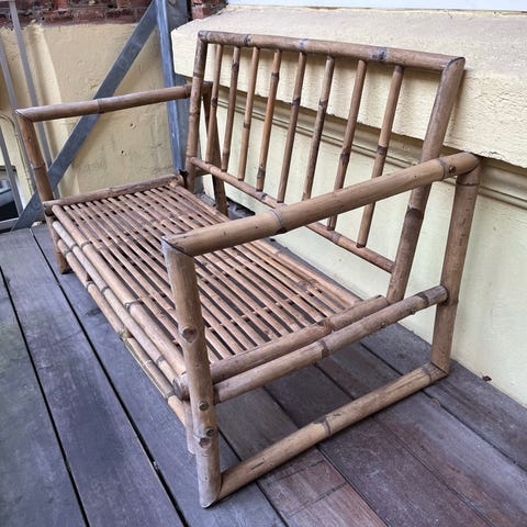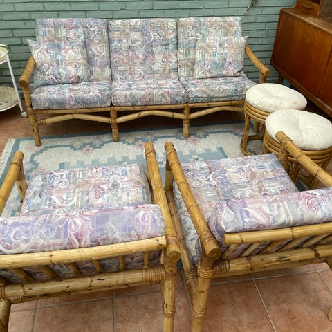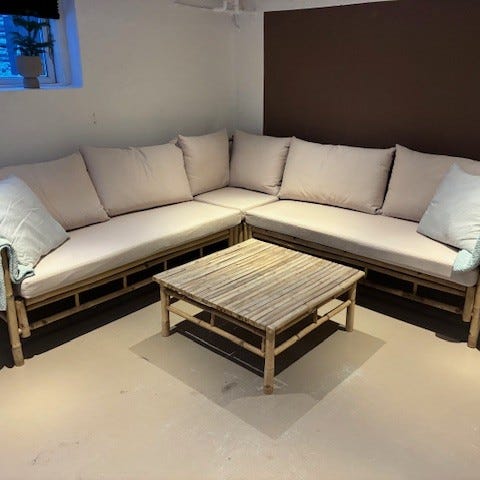 Hjørnesofa i bambus med beige hynder. Sofaen har et naturligt bambusstel og inkluderer polstrede sæde- og ryghynder i beige farve. Designet til udendørs brug.