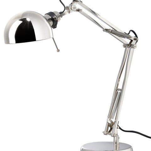 A practical metal desk lamp / floor lamp from IKEA in silver color, featuring a flexible arm and a round lampshade.