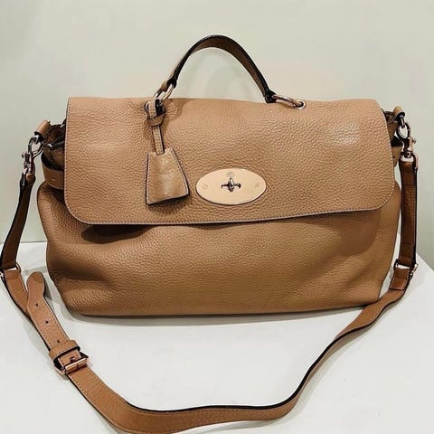 En elegant og tidløs Mulberry-model udført i eksklusivt Silky Calf-læder i den varme farve Tan. Læderet har en glat og jævn overflade med naturlig, minimal glans og en fin struktur, der bevarer formen smukt over tid. Tasken er udstyret med Mulberrys ikoniske geometriske logolås i gylden messing, som giver et sofistikeret og luksuriøst udtryk.