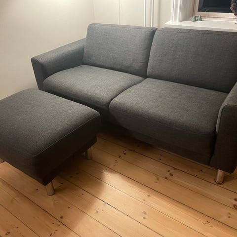 To personers sofa med puf, 2 år gammel sælges. Standen er flot. Kan først afhentes den 5 januar