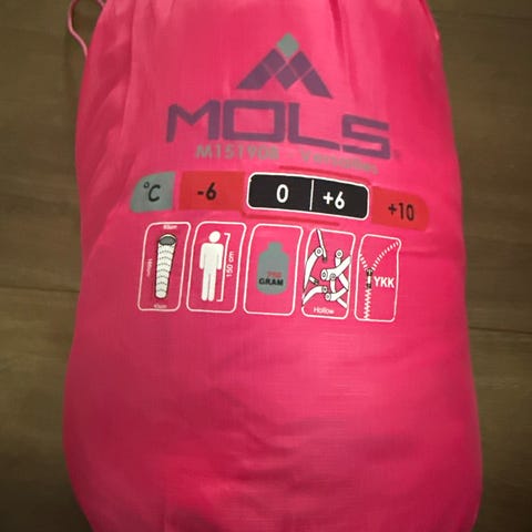 Mols sovepose til børn med temperaturinterval fra -6°C til +6°C. Farven er pink, og den er designet til brug af både mænd og kvinder. Soveposen vejer 750 gram og har en længde på 150 cm. Ubrugt.