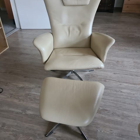 Hjort Knudsen lænestol med skammel. Trænger til rengøring. Fra dødsbo