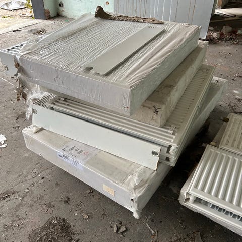Sæt bestående af hvide radiatorer i metal. Radiatorerne har en ribbet overflade og er velegnede til opvarmning af rum. Flere radiatorer i forskellige størrelser er inkluderet.
