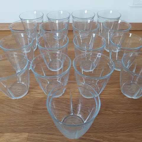 Glassene er rigtig fine og ingen tydelige brugstegn. De er meget slidstærke. Har 12 stk. billedet fra nettet er de høje glas, glassene fåes ikke længere.
