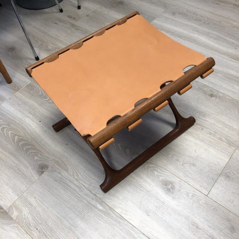Guldhøjstolen er udført af den berømte danske kunsthåndværker Poul Hundevad i teaktræ og kernelæder