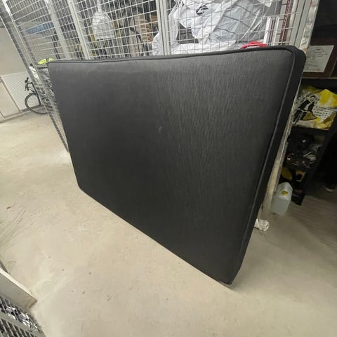 Madrassen har pletter og på rammen kan man også se, at sengen ikke er ny. Vi har sat et “støtteben” under sengen og lamellerne har vi hæftet på sengerammen så de ligger fast.