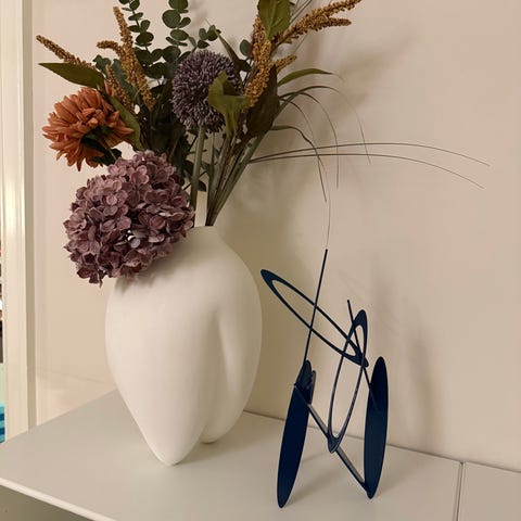 Abstrakt skulptur fremstillet i metal med moderne design. Skulpturen har en kombination af buede og rette former, hvilket skaber en dynamisk visuel effekt. Velegnet som dekorativt element i hjem eller kontor.