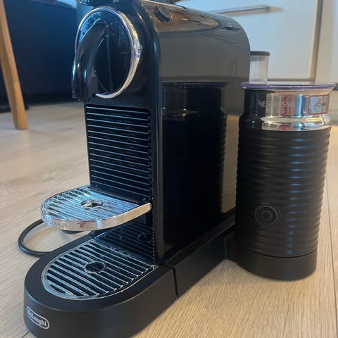 DeLonghi Nespresso Lattissima kaffemaskine med integreret mælkeskummer. Maskinen har knapper til forskellige kaffedrikke og en gennemsigtig beholder til mælk. Designet til at brygge espresso og mælkebaserede kaffedrikke.