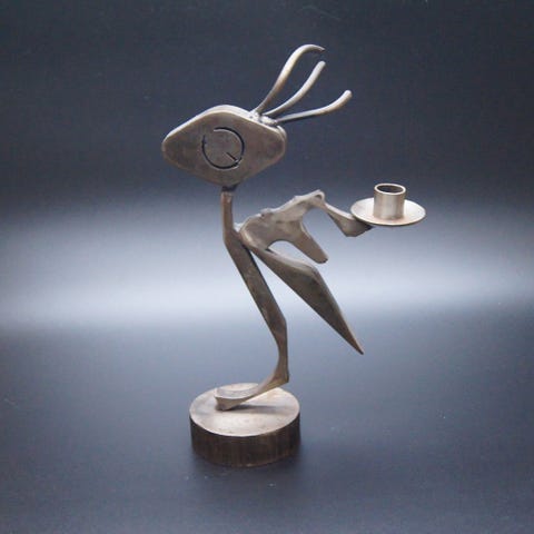 Abstrakt skulptur fremstillet i metal med moderne design. Farven er turkis. Skulpturen har en kombination af buede og rette former, hvilket skaber en dynamisk visuel effekt. Velegnet som dekorativt element i hjem eller kontor.