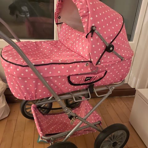 BRIO dukkevogn til børn i lyserød farve. Vognen har en klassisk ramme med store hjul og en stofbeklædning med plads til dukker. Velegnet til leg og transport af dukker.