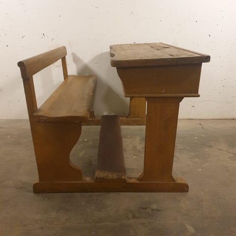 skrivebord med træbordplade og pinkmalet ramme og sæde. Designet til børn med integreret sæde og fodstøtte, egnet til brug i hjem eller institutioner.