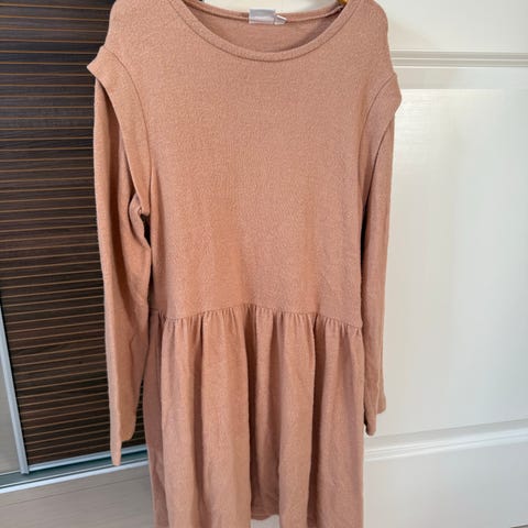 Multifarvet børnekjole i størrelse 134 med lange ærmer, elastik i ærmebund, knaplukning i nakke, rynk og stor vidde i skørt. Kjolelængden er lige under knæ.