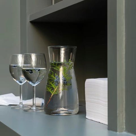 “Det enkle design gør, at karaflen af glas både kan bruges til drikkevarer og som vase”.