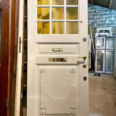 Meget smuk egetræsdør med stort vinduesparti af blyindfattede ruder i let farvet katedralglas. Døren er med meget fine rosetter og nøgleskilte samt store, flotte hængsler i messing.