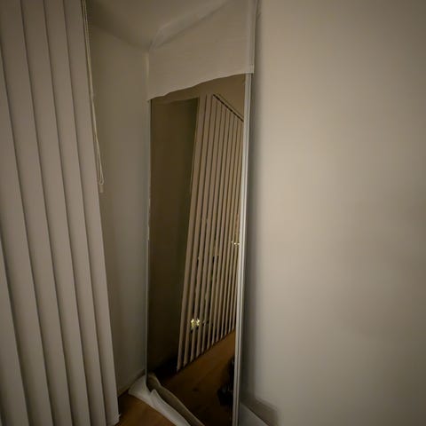 Fire skydedøre, to med spejl og to med lameller. Gamle men i fin stand. Skinner og lidt beslag følger med.