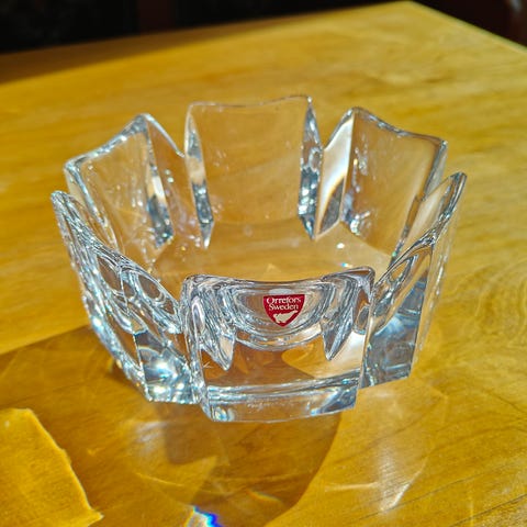 Stor skål (og tung, vejer 2.340 gr) designet af Lars Hellsten (f. 1933-) for Orrefors Glasbruk.