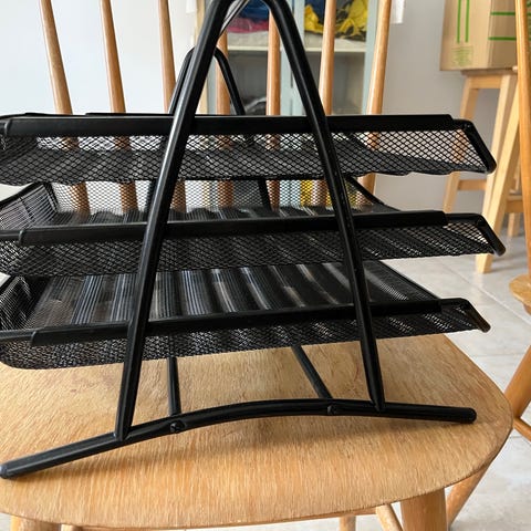 Stativ med 3 brevbakker i grå metal (trådnet). Som ny. Dog mangler der en “dut” (se sidste billede).