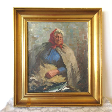 Oliemaleri af en kvinde iført tørklæde og forklæde, stående ved et bord med genstande. Maleriet er indrammet med en brun træramme. Signeret med navnet "Björg".