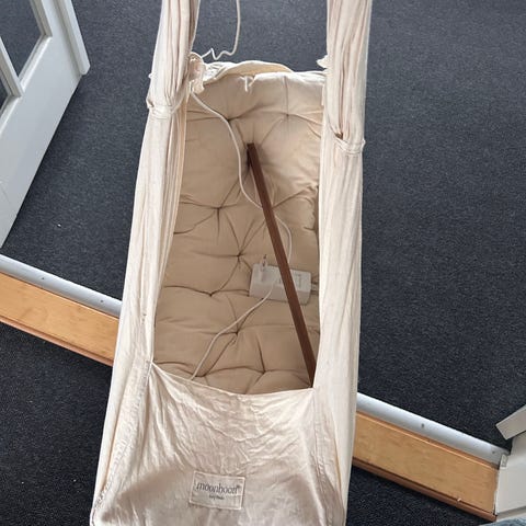 Medfølger: motor, vugge, karmbeslag, 1 x skummadras med betræk i vævet 100 % økologisk bomuld. Der har altid været lagen på madrassen.