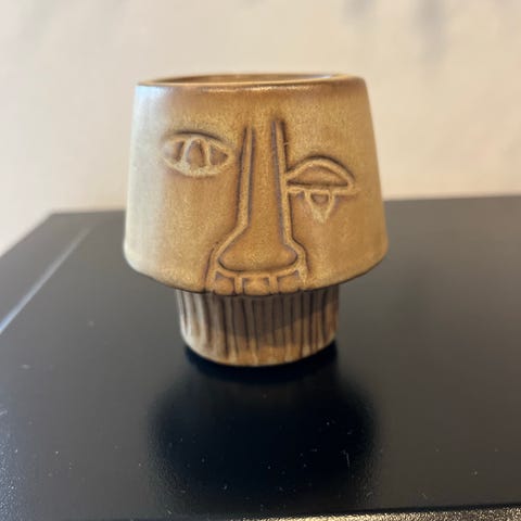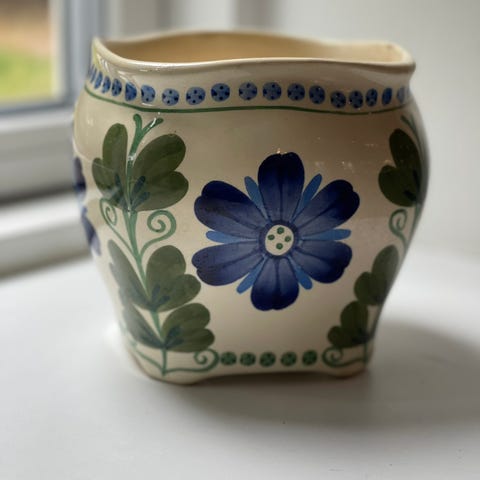 Messing urtepotte med dekorative reliefs og løvehovedhåndtag. Potten har en rund form og en solid, tung konstruktion. Velegnet til indendørs eller udendørs brug som plantebeholder.