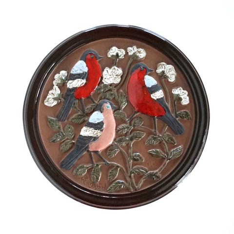 Fin keramik relief / vægplade / vægdekoration fra Gabriel Sweden. Motivet er røde blomster med brun rund ramme (glaseret).