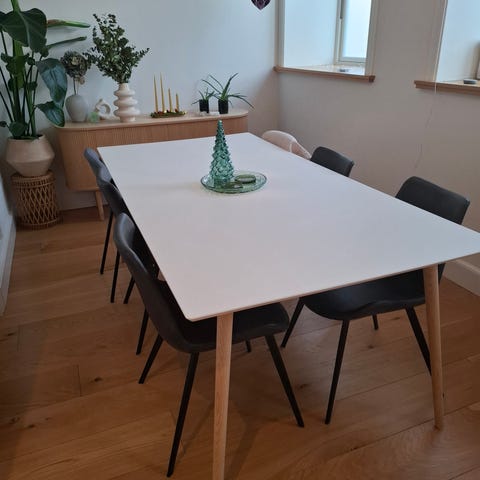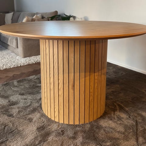 Spisebord fra Sofacompany. Måler ø120cm og 75cm i højden. Der er et par mærker, som vist på billedet, ellers et super flot bord.