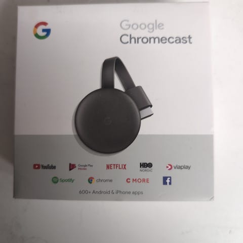 Google Chromecast Streaming-enhed i HD-kvalitet. Enheden leveres med fjernbetjening og understøtter populære streamingtjenester som YouTube, Netflix, Disney+, og Google Play. Designet til at streame indhold trådløst til tv.