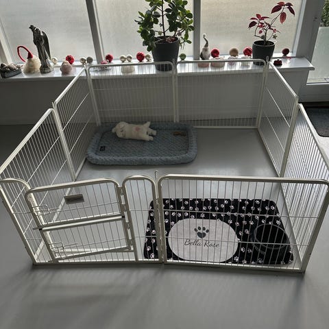 Ollipet Hundegård i metal med flere paneler, sort farve. Egnet til at skabe et sikkert område til hunde indendørs eller udendørs. Inkluderer en dør for nem adgang. Plastikken sidder stadig på skiltet. Brugt i en kort periode. Vi har været meget glade for den.