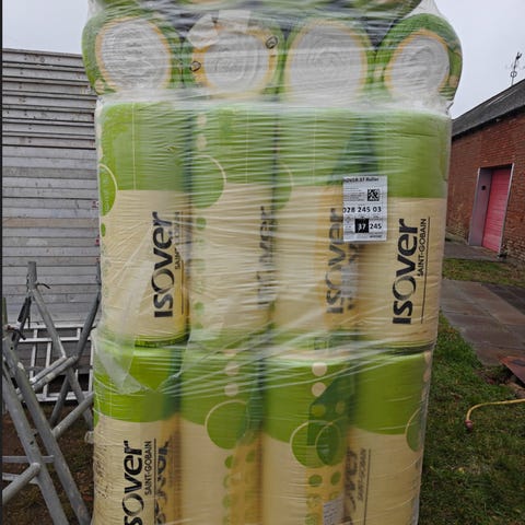 Isover Glasuld isolering i pakker. Materialet er glasuld, velegnet til isolering i byggeri for forbedret varme- og lydisolering.