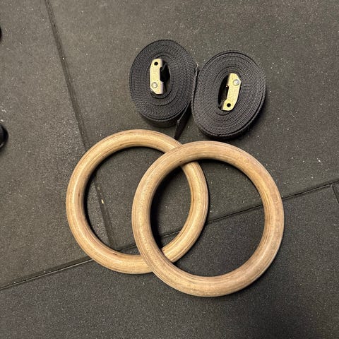 Træ gymnastic rings med sorte justerbare stropper. Ringenes materiale er træ, og stropperne er lavet af sort stof. Velegnet til træning og gymnastik.