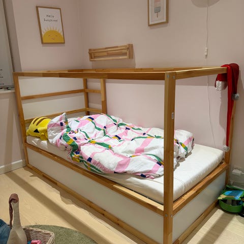 IKEA Højseng til børn i træ. Sengen har en enkel og naturlig finish, der passer til forskellige børneværelser. Designet som en højseng med plads under til opbevaring eller leg. Passer til standard madrasstørrelse. Kan bruges til børn som ønsker en seng med ekstra plads under.