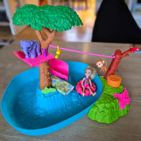 Chelseadukken kan flyde på vandet i baderingen, tage svævebanen til den anden side eller rutsche med hendes dyrevenner (aben, elefanten, tigeren og papegøjen). Bassinet kan fyldes med vand, og ved tryk på træstubben/den orange knap, pumpes vandet rundt i bassinet. Chelsea kan bøjes i hofterne, så hun nemt kan sidde på sin badering, mens hun flyder omkring på floden.