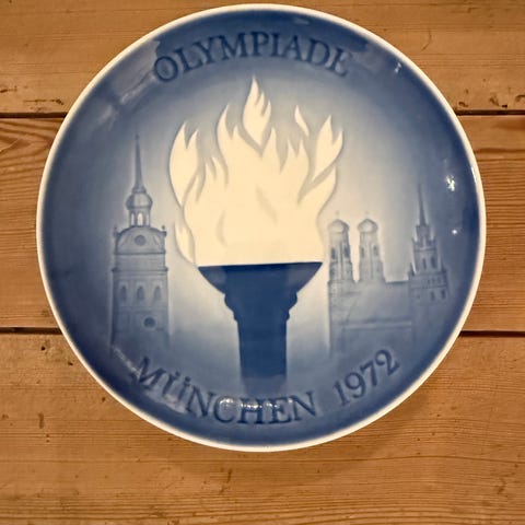 Bing & Grøndahl Olympia München dekorationsplade med blå-hvidt motiv af bybillede. Pladen er lavet i porcelæn og har et klassisk design med detaljeret gengivelse af München by. Velegnet til samling eller som dekoration.