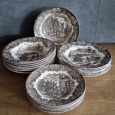 Vajilla fra Ridgways (Staffordshire), dekoreret med motivet 'MING' i blå calque, med rige, meget detaljerede kanter. Fremstillet i England i slutningen af det 19. århundrede, blev Ridgways et af de mest prestigefyldte producenter og eksporterede sin porcelæn til Europas fineste borde. Denne model, kaldet Royal Semi Porcelain, blev distribueret i Frankrig af de prestigefyldte huse og stormagasiner som E. Bourgeois, Grands Dépôts (Paris), et referencepunkt